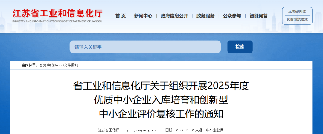 申报通知(点击查看):江苏省工业和信息化厅 关于组织开展2025年度优质中小企业入库培育和创新型中小企业评价复核工作的通知 苏工信中小〔2025〕131号
