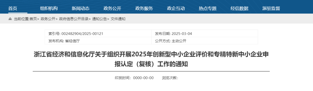 申报通知:浙江省经济和信息化厅 关于组织开展2025年创新型中小企业评价和专精特新中小企业申报认定(复核)工作的通知