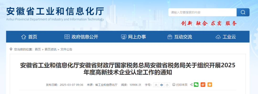 申报通知(点击查看):安徽省工业和信息化厅 安徽省财政厅 国家税务总局 安徽省税务局 关于组织开展2025年度高新技术企业认定工作的通知