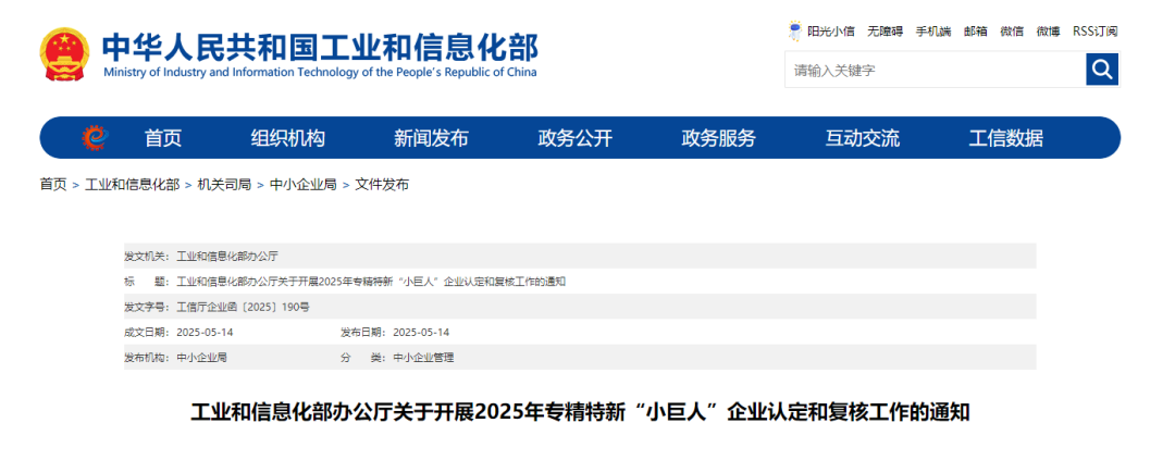 申报通知(点击查看):工业和信息化部办公厅 关于开展2025年专精特新“小巨人”企业认定和复核工作的通知 工信厅企业函〔2025〕190号