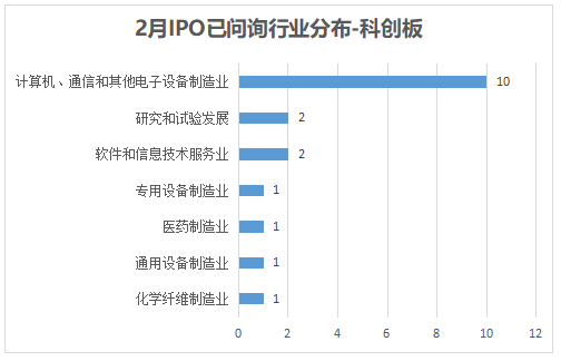 截至2022年2月28日,根据2月IPO已问询企业行业分布来看,计算机、通信和其他电子设备制造业位列第一,有10家;研究和试验发展第二,有2家。