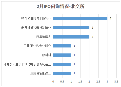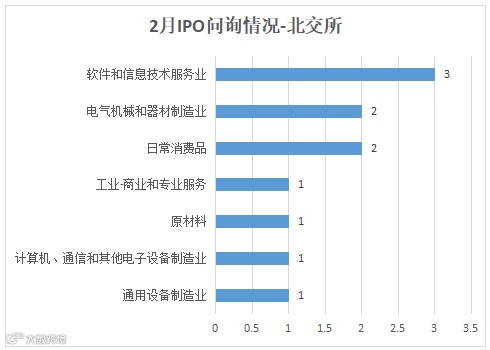 截至2022年2月28日,根据2月IPO已问询企业行业分布来看,软件和信息技术服务业位列第一,有3家;电气机械和器材制造业、日常消费品业并列第二,分别有2家。
