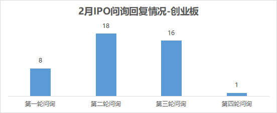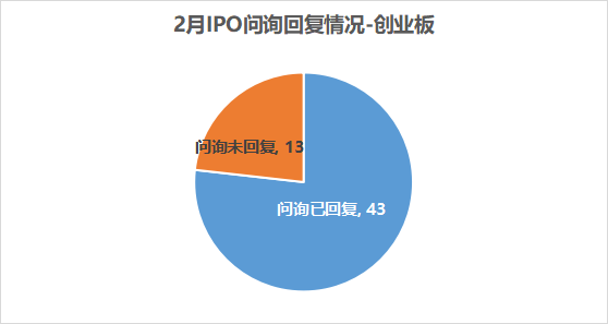 2月1日-2月28日,创业板处于“已问询状态”的企业有56家,其中43家在2月已回复问询,13家暂未回复问询。