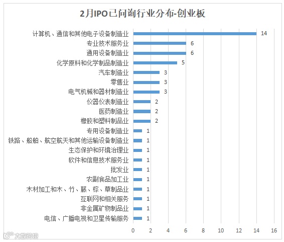 截至2022年2月28日,根据2月IPO已问询企业行业分布来看,计算机、通信和其他电子设备制造业位列第一,有14家;通用设备制造业和专业技术服务业并列第二,分别有6家。