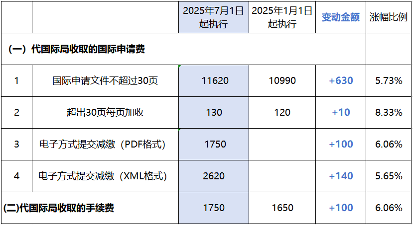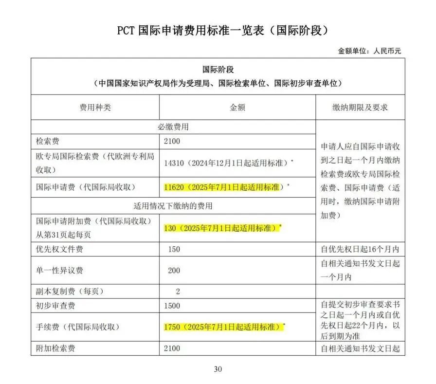 向国家知识产权局提交且收到日在2025年7月1日(含当日)之后的PCT申请的国际申请费,以及收到日在2025年7月1日(含当日)之后的PCT国际初步审查要求的手续费,适用本标准。
