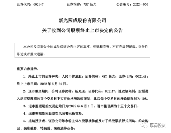5月24日,*ST新光公告,深交所决定终止公司股票上市。退市整理期的交易起始日为6月1日,退市整理期为十五个交易日。股票进入退市整理期的首个交易日不实行价格涨跌幅限制,此后每个交易日的涨跌幅限制为10%。
