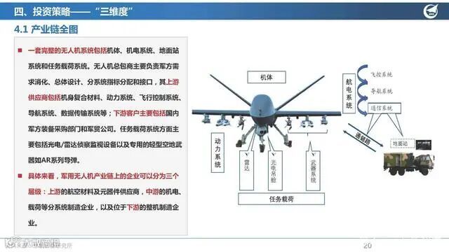 一套完整的无人机系统包括机体、机电系统、地面站 系统和任务载荷系统。无人机总包商主要负责军方需 求消化、总体设计、分系统指标分配和接口,其上游 供应商包括机身复合材料、动力系统、飞行控制系统、 导航系统、数据传输系统等;下游客户主要包括国内 军方装备采购部门和军贸公司。任务载荷系统方面主 要包括光电/雷达侦察监视设备以及专用的轻型空地武 器如AR系列导弹。