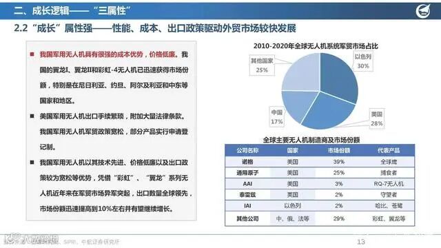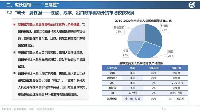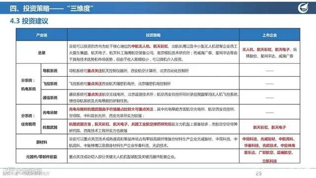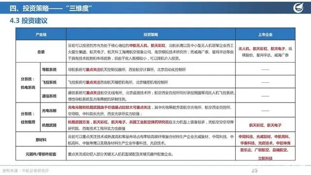 其中,“翼龙”系列生产商中航(成都)无人机公司、“彩虹”系列生产商航天彩虹、“长鹰” 系列生产商北航天宇长鹰主要生产中大型长航时无人机。航天电子、南京模拟技术研究所、航 天科工302所、西工大爱生集团以及威海广泰等,其无人机生产规模大、技术先进,是国内中 小型军用无人机的领军企业。