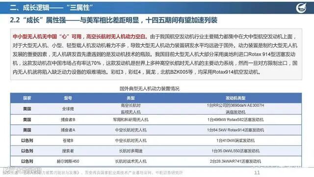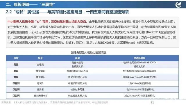 中小型无人机无中国“心”可用,高空长航时无人机动力空白。由于我国航空发动机行业主要精力都集中在大中型航空发动机上面, 对于大型无人机、小型、轻型载人机发动机着力不多,导致大型无人机动力装置研发水平均远逊于国外。动力装置是制约大型无人机 发展的重要因素,无人机研发首先遭遇到的是发动机技术的瓶颈。我国目前大型无人机大部分采用奥地利进口Rotax 914型活塞发动 机,这款发动机在中国市场占有率达70%,这款发动机是世界上多种高空长航时无人机的主要动力系统,然而一旦对方限制出口,国 内无人机就将陷入缺乏动力设备的艰难境地。彩虹3,彩虹4,翼龙,北航BZK005等,均采用Rotax914航空发动机。