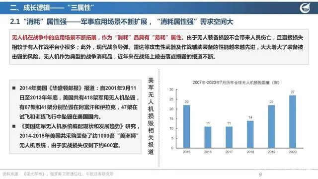 无人机在战争中的应用场景不断拓展,作为“消耗”品具有“易耗”属性。由于无人装备损毁不会带来人员伤亡,且直接损失 相较于有人作战平台小很多;此外,现代战争导弹、雷达等攻击性武器及作战辅助装备的性能越来越先进,大大增大了装备被 击毁的风险。无人机作为典型的战争消耗品,近年来在战场上被击落或损毁的报道不断。
