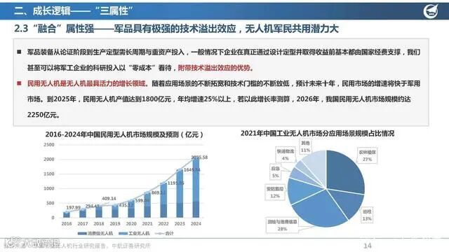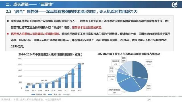 民用无人机是无人机最具活力的增长领域。随着应用场景的不断拓宽和技术门槛的不断放低,预计未来十年,民用市场的增速将快于军用 市场。到2025年,民用无人机产值达到1800亿元,年均增速25%以上,若以此增长率测算,2026年,我国民用无人机市场规模约达 2250亿元。