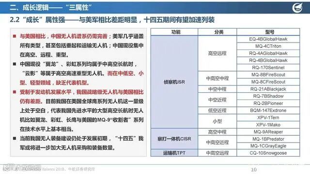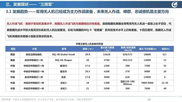 受制于发动机发展水平,我国战略级无人机与美国相比 仍有差距。目前我国在美国全球鹰系列无人机这一量级 上处于空白,代表我国先进水平的大型高空长航时无人 机比如翼龙、彩虹、长鹰与美国的MQ-9“收割者”系列 在技术水平上基本相当。