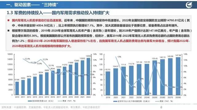 国内军用无人机需求推动行业迅速发展。近年来,中国国防预算持续保持中高速增长。2022年全国财政安排国防支出预算14760.81亿元(其 中,中央本级安排14504.50亿元),比上年预算执行数增长7.1%。其中,加大武器装备建设处于首要位置,装备费用占比逐年提升。