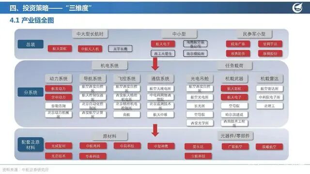 具体来看,军用无人机产业链上的企业可以分为三个 层级:上游的航空材料及元器件供应商,中游的机电、 载荷等分系统制造企业,以及位于下游的整机制造企 业。
