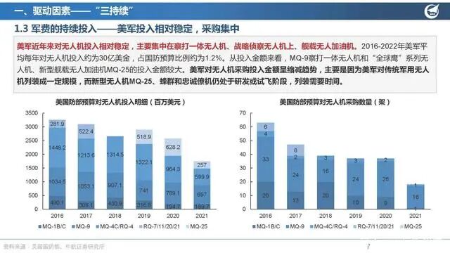 美军近年来对无人机投入相对稳定,主要集中在察打一体无人机、战略侦察无人机上、舰载无人加油机。2016-2022年美军平 均每年对无人机投入约为30亿美金,占国防预算比例约为1.2%。从投入金额来看,MQ-9察打一体无人机和“全球鹰”系列无 人机、新型舰载无人加油机MQ-25的投入金额较大。美军对无人机采购投入金额呈缩减趋势,主要是因为美军对传统军用无人 机列装成一定规模,而新型无人机MQ-25、蜂群和忠诚僚机仍处于研发或试飞阶段,列装需要时间。