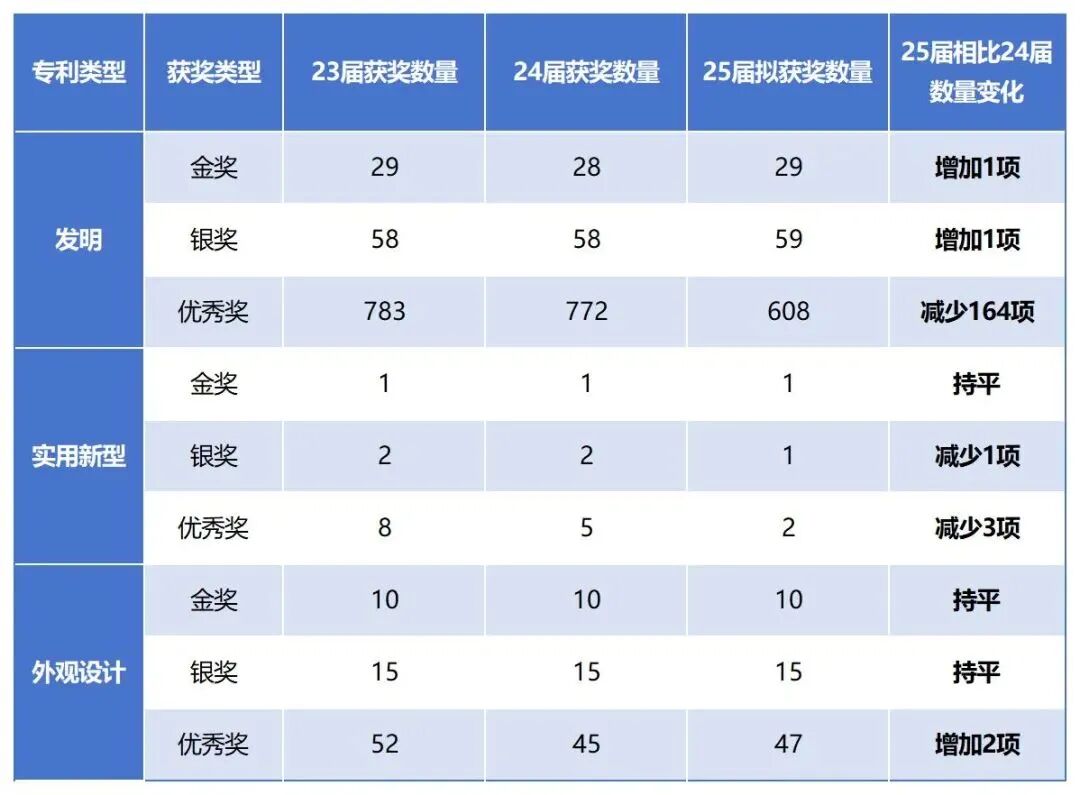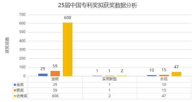 第二十五届中国专利奖共评选出中国专利金奖预获奖项目30项,中国外观设计金奖预获奖项目10项,中国专利银奖预获奖项目60项,中国外观设计银奖预获奖项目15项,中国专利优秀奖预获奖项目610项,中国外观设计优秀奖预获奖项目47项。