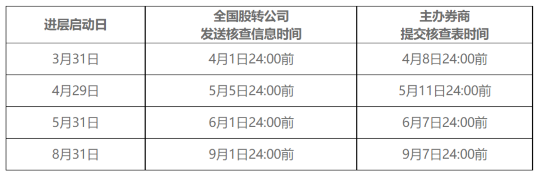 根据修订后的分层管理制度,全国股转公司同步发布了2022年创新层进层实施相关工作通知,明确了分批进层具体时间安排。挂牌公司及主办券商等中介机构可以结合企业发展规划、年报披露进度等具体情况,合理选择进层时间,稳步有序、实事求是地做好自查、核查等各项准备工作。