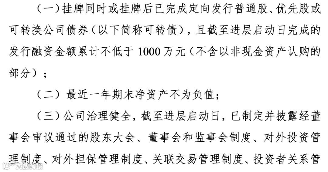 据了解,修订后的《分层管理办法》于3月4日正式实施,挂牌公司进入创新层,应当符合下列条件之一: