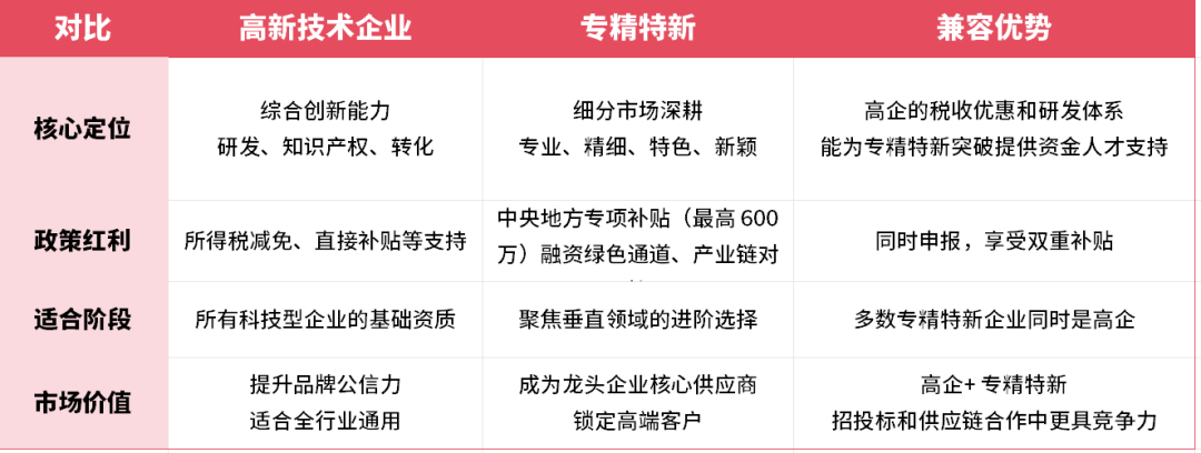 需要强调的是,高企侧重综合创新能力,专精特新聚焦细分领域突破,它们各具优势,并不冲突,两者结合可实现政策红利和市场价值叠加优势。