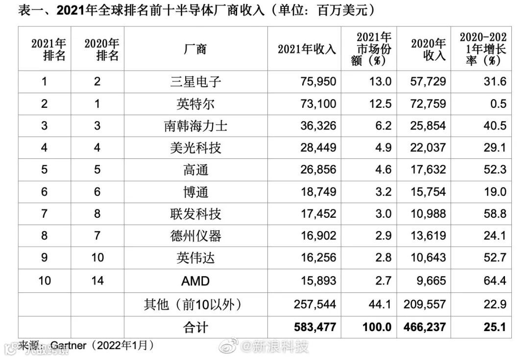 Gartner:2021年全球半导体收入增长超25%,三星市场份额重返第一