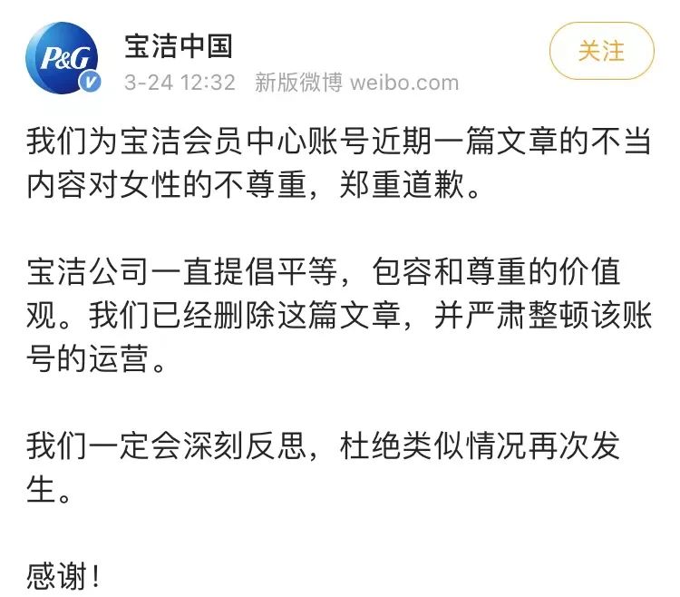 宝洁就不当内容道歉:已删除文章,严肃整顿账号运营