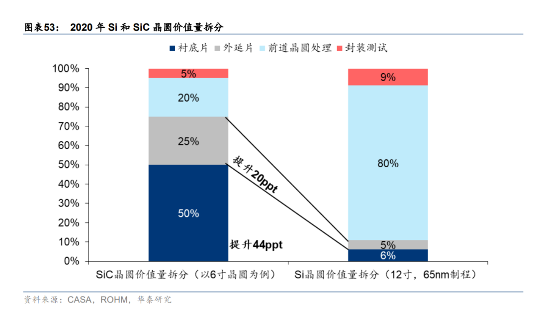 相比于 Si,SiC 衬底和外延为制造产业链核心环节,合计价值量占比超 60%。在传统硅基器件制造过程中,需要在硅片基础上进行氧化、涂层、曝光、光刻、刻蚀、清洗等多个前道处理步骤,从而产生更高附加值。SiC 材料则仅用于分立器件制造,其前端工艺难度不大,而衬底和外延需在高温、高压环境中生成,生长速度缓慢,为关键技术难点,占据产业链主要价值量。据 CASA Research 数据显示,在传统硅基器件中,硅片前道处理附加价值量达到 80%,衬底和外延环节仅占 11%;而在碳化硅器件的成本构成中,衬底和外延占比分别为 50%和 25%,合计达到 75%,为产业链中价值量最高环节。此外,衬底和外延质量对器件性能优劣起至关重要作用,提升其良率为碳化硅器件制备主要攻克目标。