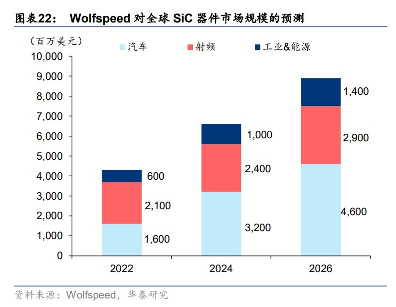 (2)碳化硅材料方面, Wolfspeed 认为市场供应将持续增加,但产能仍将供不应求,Wolfspeed 预计 2022 年碳化 硅材料市场达 7 亿美元,2024 年进一步增长至 12 亿美元,并于 2026 年突破 17 亿美元, 2022 至 2026 年增长近 2.5 倍。同时,公司预期 150mm 向 200mm 工艺节点的转变将带来成本优化,进一步促进市场需求扩增。