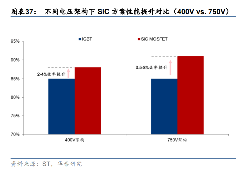 2)高压下性能优势更加明显:在 400V 左右的直流母线电压下,需要最大工作电压在 650V 左右的 IGBT 模块或单管。在 800V 的系统电压下,功率器件耐压需要提高到 1200V 以上。英飞凌、赛美控、罗姆、富士电机等均推出了 1200V 的车规级 IGBT,但对比之下,SiC 器件在高压下性能更好。根据 ST 的数据,在 400V 电压平台下,SiC MOSFET 能够比 IGBT 器件拥有 2-4%的效率提升;而在 750V 电压平台下其提升幅度则可增大至 3.5-8%。对比市场上的领先 SiC MOSFET 和 IGBT 器件参数可知,1200V SiC 产品优势较 650V 产品优势更加明显,主要体现为损耗降低幅度更大。