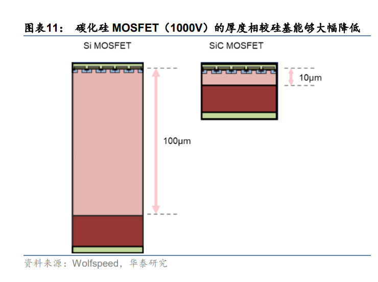 SiC MOSFET 较 IGBT 可同时具备耐高压、低损耗和高频三大优势。1)碳化硅击穿电场强度是硅的十余倍,使得碳化硅器件耐高压特性显著高于同等硅器件。2)碳化硅具有 3 倍于硅的禁带宽度,使得 SiC MOSFET 泄漏电流较硅基 IGBT 大幅减少,降低导电损耗。同时, SiC MOSFET 属于单极器件,不存在拖尾电流,且较高的载流子迁移率减少了开关时间,开关损耗因此得以降低。根据 Rohm 的研究,相同规格的碳化硅 MOSFET 较硅基 IGBT 的总能量损耗可大大减低 73%。3)涵盖 MOSFET 自身特点,较 IGBT 具备高频优势。此外,据 Wolfspeed 研究显示,相同规格的碳化硅基 MOSFET 与硅基 MOSFET 相比,其尺寸可 大幅减少至原来的 1/10。