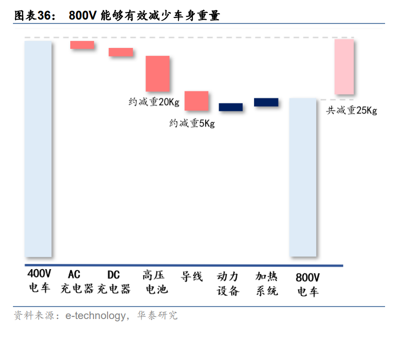 此外,800V 系统可有效减少车身重量,实现续航提升。在相同功率的情况下,800V 系统较 400V 系统电流降低一半,可减少系统热损耗及导线横截面。根据 e-technology 的估算,以 100kWh 的电池为例,从 400V 电车系统提升为 800V 电车系统,由于电池散热减重及导线质量降低可以推动整车实现 25kg 的重量降低,从而提升续航。