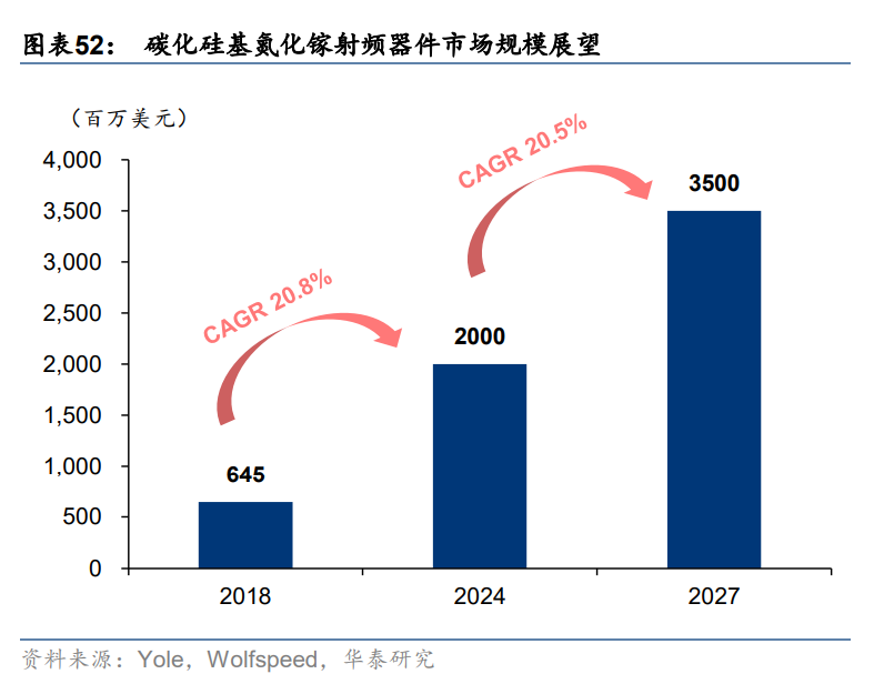 据 Yole 和 Wolfspeed 预测,2024年碳化硅基氮化镓功率器件市场有望突破 20 亿美元,2027 年进一步增长至 35 亿美元。根据我们的预测,受益 5G 通讯快速发展,通讯频段向高频迁移,基站和通信设备需要支持高频性能的 PA,碳化硅基氮化镓射频器件相比硅基 LDMOS 和 GaAs 的优势将逐步凸显,我们测算 2020年全球碳化硅射频器件市场规模为 8.92 亿美元,预计到 2025 年将增长至 21.21 亿美元,对应 CAGR 为 18.9%,和 Yole 和 Wolfspeed 预测基本一致。