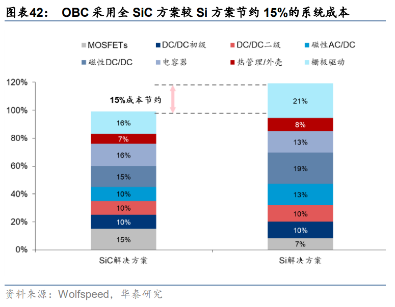 全 SiC MOSFET 方案降低 OBC 系统尺寸、重量和成本,同时提高运行效率。根据Wolfspeed 的研究,采用全 SiC MOSFET 方案的 22 kW 双向 OBC,可较 Si 方案实现功率器件和栅极 驱动数量都减少 30%以上,且开关频率提高一倍以上,实现系统轻量化和整体运行效率提 升。SiC 系统在 3kW/L 的功率密度下可实现 97%的峰值系统效率,而 Si OBC 仅可在 2kW/L 的功率密度下实现 95%的效率。同时,进一步拆分成本,由于 SiC 器件的性能可减少 DC/DC 模块中所需大量的栅极驱动和磁性元件。因此,尽管相比单个 Si 基二极管和功率晶体管, SiC 基功率器件的成本更高,但整体全 SiC 方案的 OBC 成本可节约 15%左右。