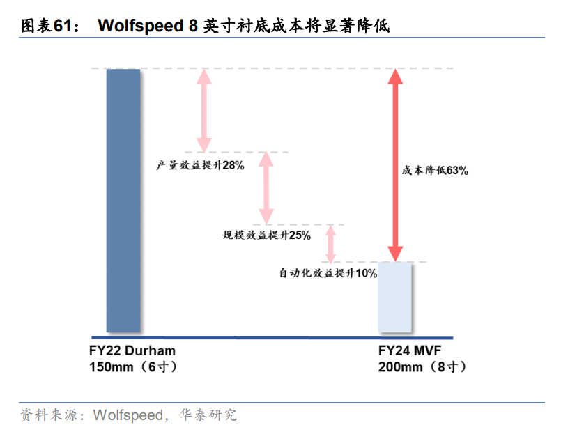 成本优势驱动衬底大尺寸化发展。衬底直径为衡量晶体制备水平重要指标之一,目前导电型碳化硅衬底以 6 英寸为主,8 英寸衬底开始发展,而半绝缘碳化硅衬底以 4 英寸为主,逐渐向 6 英寸、8 英寸方向发展。单片衬底制备芯片数量随衬底尺寸增大而增多,同时边缘芯片占比也显著改善。碳化硅晶圆从 6 英寸扩径到 8 英寸,芯片数量将由 448 增长至 845 颗, 边缘芯片占比也将从 14%减少至 7%,带来单位芯片成本大幅降低。Wolfspeed 于 2019 年开始建设 8 英寸衬底产线,公司预计将于 2024 财年达产。Wolfspeed 表示 2024 财年 MVF 晶圆厂单颗 MOSFET 裸片成本有望降低 63%,其中 28%的降本来自良率(产量效率)提升,25%来自规模效应,10%来自自动化带来的人工成本和生产周期改善,衬底大尺寸带来成本优势显著。