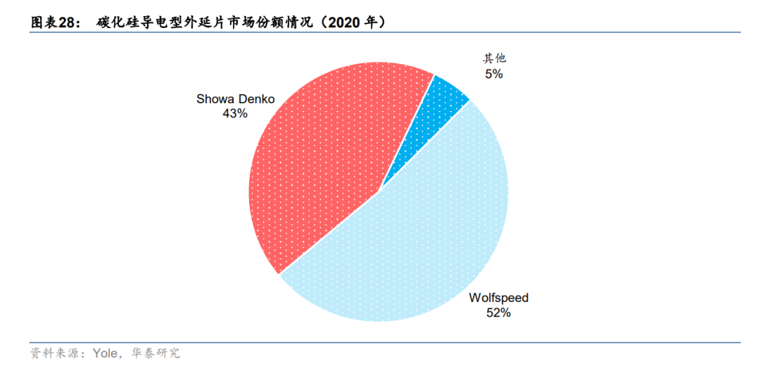 Wolfspeed、Showa Denko 双寡头垄断碳化硅外延片市场。碳化硅外延片属于行业产业链中间环节,参与厂商多为 IDM 公司,Industry Research 测算 2020 年全球碳化硅外延片市 场规模约为 1.72 亿美元。据 Yole 数据,2020 年 Wolfspeed 与 Showa Denko 分别占据碳化硅导电型外延片市场52%和43%的市场份额,合计高达95%,具备显著的制备技术优势。其他碳化硅外延供应商包括Ⅱ-Ⅵ、Norstel、罗姆、三菱电机、英飞凌,占据市场较小份额。国内碳化硅外延片主要制造厂商有瀚天天成和东莞天域半导体,两者均已具备供应 4-6 英 寸外延片实力,待产能进一步释放。