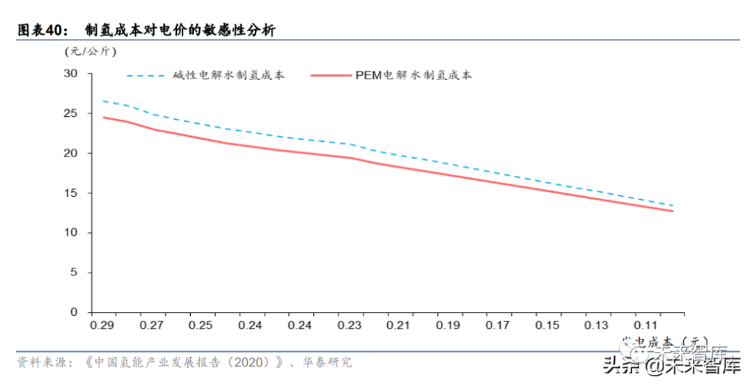 2)风光发电成本的下降。根据 CPIA 及 CWEA 的数据,我们测算,当电价降至 0.2 元 /kWh 时,电解水制氢成本将降低至 18 元/kg 左右。当电价降至 0.1 元/kWh 时,电解水制 氢成本将降低至 13 元/kg 左右。