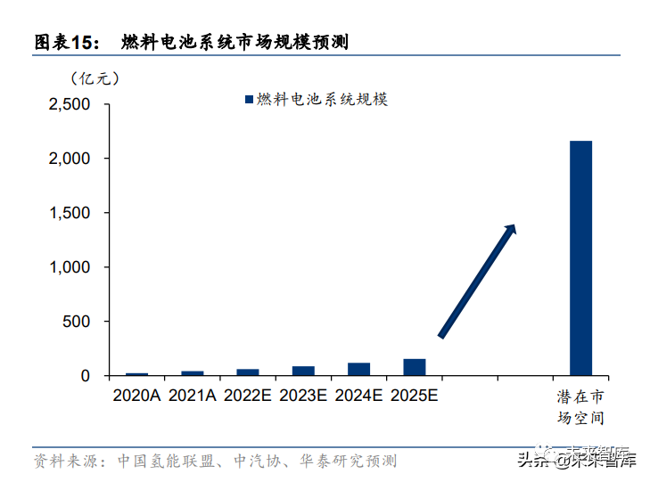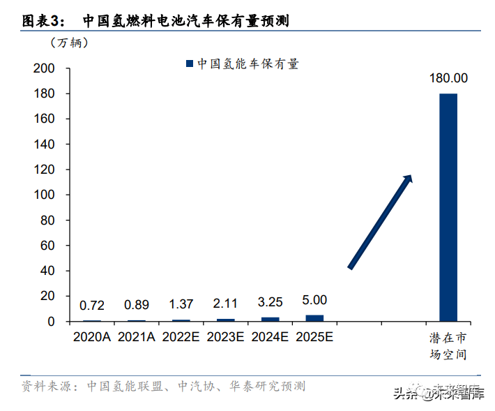 《氢能产业发展中长期规划(2021-2035 年)》规划到 2025 年,氢燃料电池车辆保有量约 5 万辆,未来 4 年燃料电池系统累计市场需求为 155 亿元,根据各地方政府规划的 2025 年推 广氢燃料电池汽车数量累计 8 万辆,未来 4 年燃料电池系统累计市场规模为 248 亿元,如果 燃料电池系统在商用车领域全面推广,年销量达到 180 万辆车,潜在年需求为 2160 亿元。