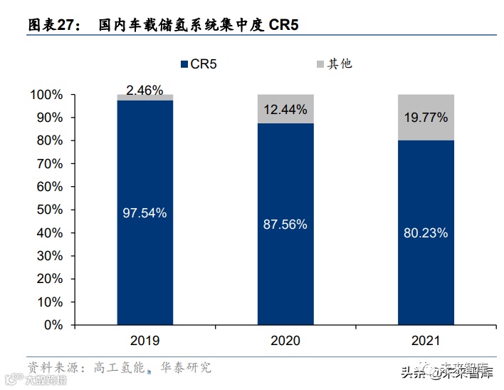 国内车载储氢系统市场格局从集中逐渐走向分散。国外 70MPa 氢气瓶研究起步较早,应 用相对成熟,主要机构包括挪威 HexagonComposites、美国 Quantum、日本丰田、韩国 ILJINComposite 等,目前产品以Ⅳ型瓶为主,储氢密度均在 5.0wt%左右。2021 年中国车 载储氢系统出货量前五企业集中度(CR5)为 80.23%,相较 2020 年下降 7.33pct,比 2019 年下降 17.31pct。2020~2021 年前三家分别为国富氢能、舜华新能源、科泰克。2019~2021 年国富氢能市占率从 43.7%下降到 37.9%,保持第一,逐年略有下降。