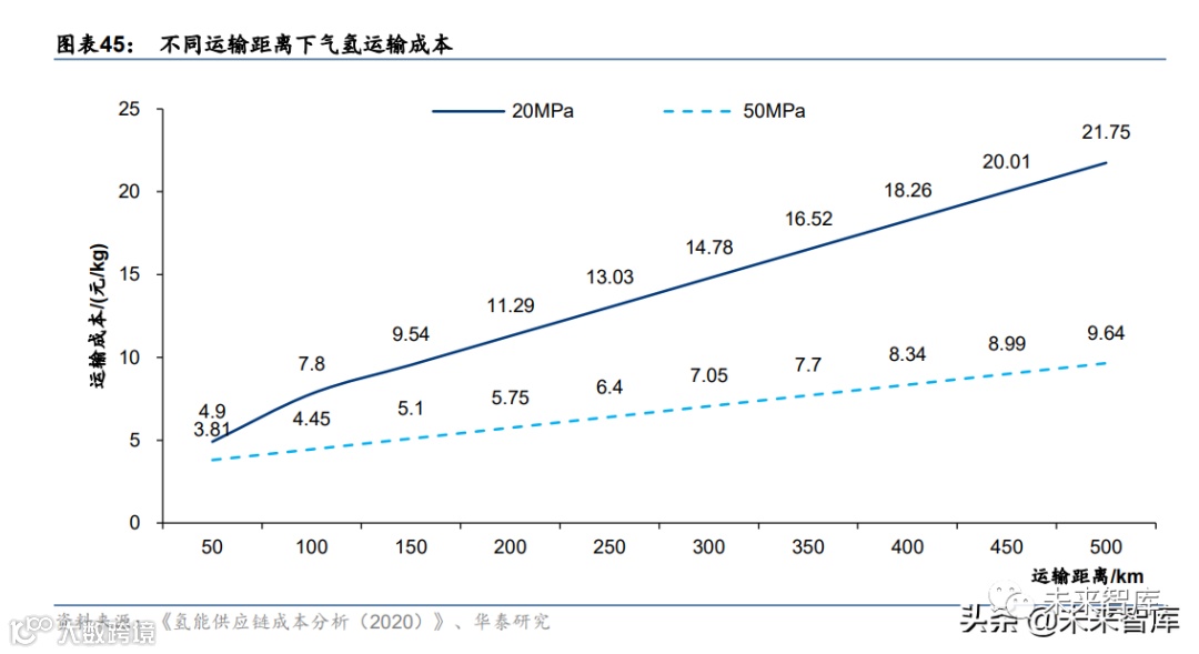 压力等级提升,可显著降低气态运氢成本,50MPa 长管拖车 500km 运输成本 9.64 元/kg 。 20MPa 长管拖车运氢一般适用于 200km 内的短距离和运量较少的运输场景,随着距离增 加,50MPa 下的成本优势越来越明显。从经济性角度出发,加大钢瓶储氢压力势在必行, 我们认为这将是未来高压气氢运输的发展方向。