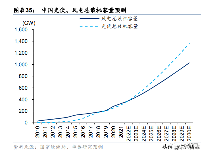 双碳目标明确后,风电发电战略地位提升。根据国家能源局最新消息:2021 年我国风电 和光伏发电新增装机规模达到 100.54GW,其中风电新增 47.57GW,光伏发电新增 52.97GW。我们预计 2025/2030 年中国风电/光伏总新增装机容量为 193/237GW,到 2025/2030 年中国风电/光伏总装机容量为 1281/2390GW。