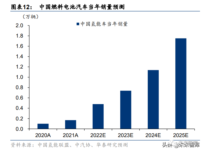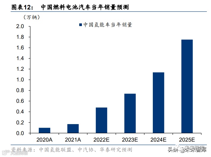 中汽协数据,截至 2021 年,国内燃料电池汽车保有量为 8938 辆,2016~2021 年国内氢 燃料电池汽车销量分别为 629、1275、1527、2737、1177、1586 辆,根据发改委 2022 年 3 月 23 日发布的《氢能产业发展中长期规划(2021-2035 年)》,规划到 2025 年,氢燃 料电池车辆保有量约 5 万辆,2022-2025 年 CAGR=54.0%。根据示范城市群申报,截至 2025 年累计推广 3.3 万辆,根据各地方政府产业规划, 2025 年规划累计推广 8 万辆。