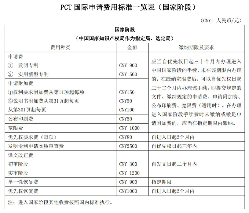 PCT国家阶段(中国国家知识产权局作为指定局、选定局)缴纳的费用包括申请费、申请附加费、公布印刷费、优先权要求费、宽限费、发明专利申请实质审查费、译文改正费、单一性恢复费、优先权恢复费。进入国家阶段其他收费按照国内标准执行。