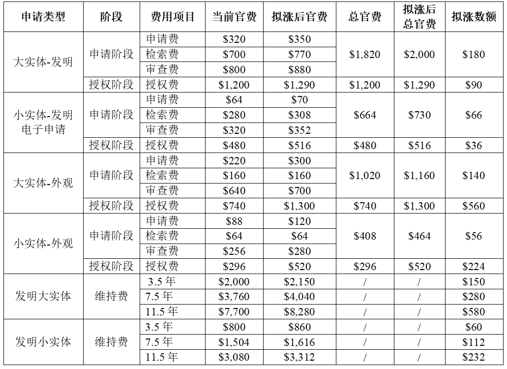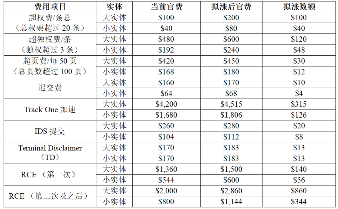 USPTO会对多项费用进行普遍上涨,包括但不限于: