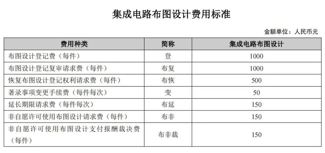 集成电路布图设计的费用种类包括布图设计登记费、布图设计登记复审请求费、恢复布图设计登记权利请求费、著录事项变更手续费、延长期限请求费、非自愿许可使用布图设计请求费、非自愿许可使用布图设计支付报酬裁决费。