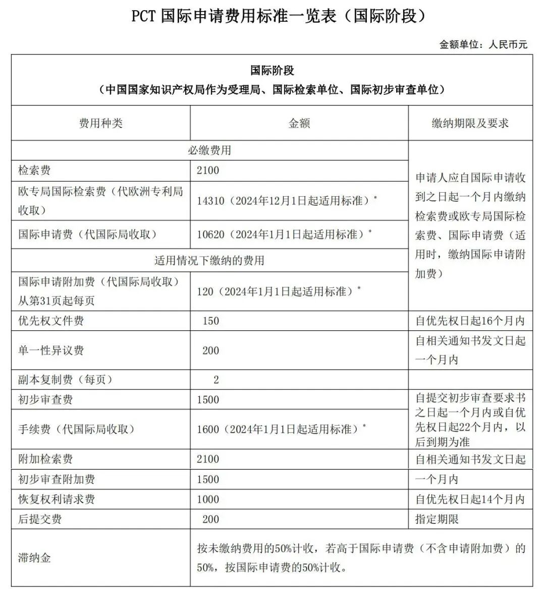需要注意的是:国际申请费及其附加费和国际初步审查手续费为代世界知识产权组织国际局收取,数额根据世界知识产权组织每年公布的下一年度PCT申请国际阶段费用的人民币标准确定,原则上维持一年有效,如因汇率波动过大等原因需调整标准将另行公布。具体费用标准及相关减缴规定可在国家知识产权局网站专利合作条约(PCT)专栏进行查询。