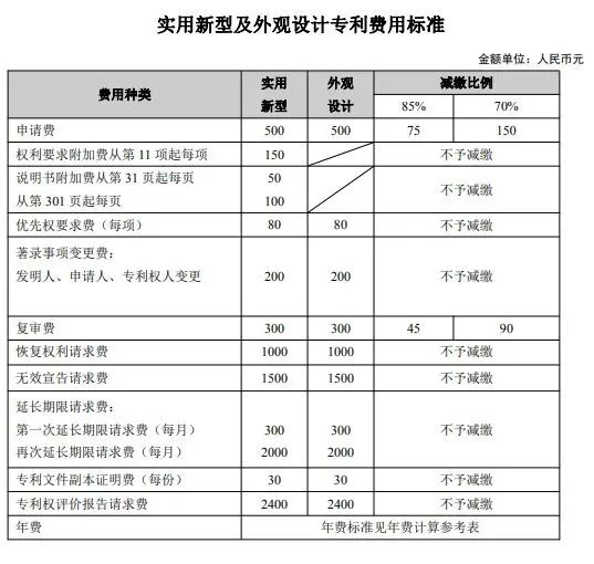 现行收费标准详见附件2。专利和集成电路费用标准及相关收费减缴办法以发改委和财政部最新发布为准。通过《工业品外观设计国际注册海牙协定》进入我国的外观设计国际申请,缴纳的第一期和第二期单独指定费,可按照《财政部 国家发展改革委关于印发<专利收费减缴办法>的通知》(财税[2016]78号)、《财政部 国家发展改革委关于停征免征和调整行政事业性收费有关政策的通知》(财税[2018]37号)、《财政部 国家发展改革委关于减免部分行政事业性收费有关政策的通知》(财税[2019]45号)的规定进行减缴。
