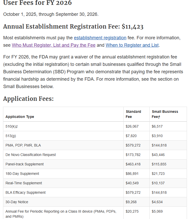 2025年7月30日,美国食品药品监督管理局(FDA)正式公布了2026财年(2025年10月1日至2026年9月30日)的医疗器械注册收费标准,即Medical Device User Fee。公告显示,多项涉及医疗器械企业的收费项目较上一财年有所调整,相关企业需予以高度关注。