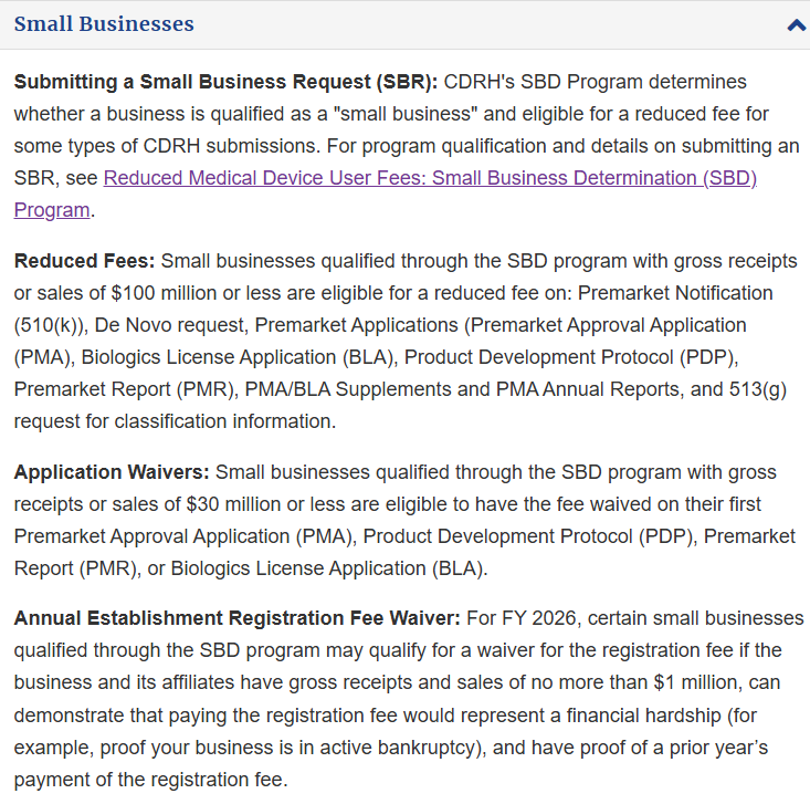 不过在费用普涨的同时,FDA也释放出了给企业减负的信号,FDA首次推出注册费豁免政策:2026财年,FDA可能会根据Small Business Determination(SBD)计划,为通过资格审查的小企业免除年度注册费(不包括初始注册),前提是这些企业证明支付费用会给他们带来经济困难,此经济困难需由FDA确定。