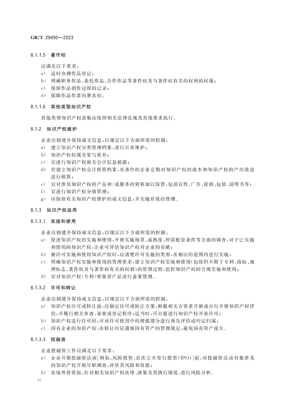 由国家知识产权局组织起草、国家知识管理标准化技术委员会(SAC/TC 554)归口管理的《企业知识产权合规管理体系 要求》(GB/T 29490-2023)已于2023年8月6日由国家市场监督管理总局、国家标准化管理委员会发布,将于2024年1月1日正式实施。相较于上一版《企业知识产权管理规范》(GB/T 29490-2013),此次修订突出了标准的合规属性,为企业建立完善知识产权管理体系、防范知识产权风险、实现知识产权价值提供了参照标准。