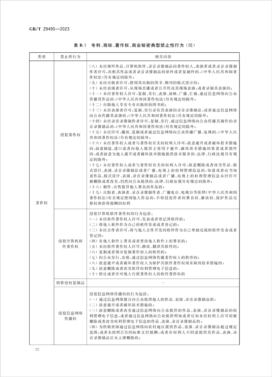 二是强化合规要素。本次修订在标准全文系统增加知识产权合规管理相关条款,明确了知识产权合规管理体系相关概念,强化了领导重视、全员参与的基本原则,将知识产权合规要求贯穿于各类型知识产权管理全链条、企业经营管理各环节全周期,并在审核改进中将知识产权合规作为重点关注内容,同时增加了“附录B.专利、商标、著作权、商业秘密典型禁止性行为列表”,旨在指导企业加强知识产权合规管理体系建设,助力企业规范知识产权管理、履行知识产权合规义务、防范知识产权风险、维护利益和保障发展。