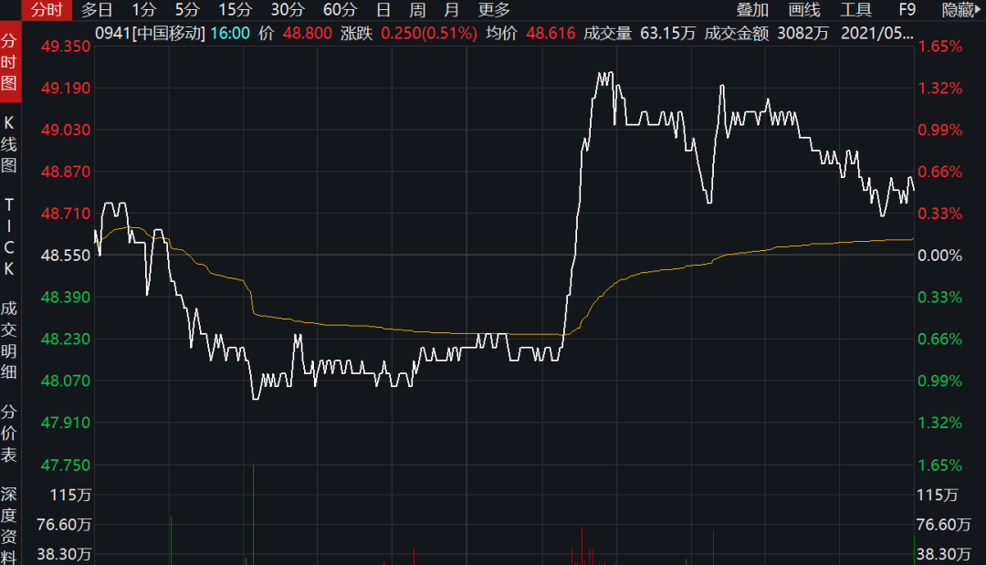 截至5月17日收盘,中国移动港股报收48.8港元/股,微涨0.51%,总市值高达9992亿港元(约合8287亿元人民币)。